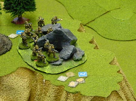 | One rifle section (8 troops in back) and survivors of the weapons section (4 troops in front) behind cover. |